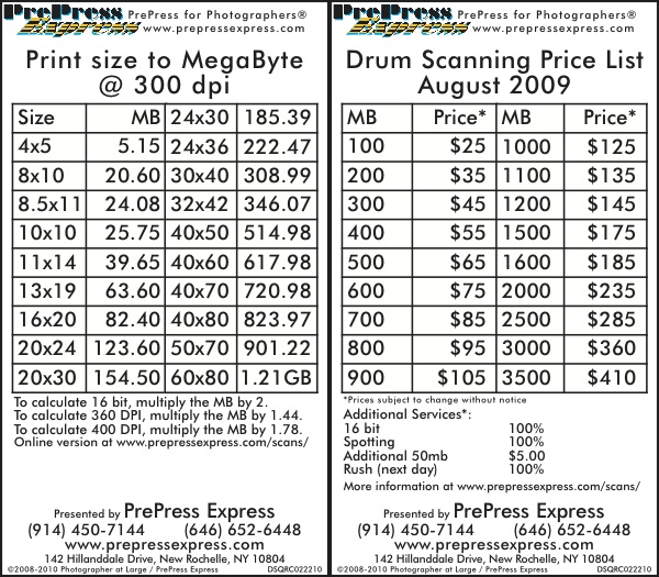 Download our Drum Scanning Quick Reference Cards On the left card, we have standard scan sizes and there equivalent size in megabytes. The right card contains our retail price list.